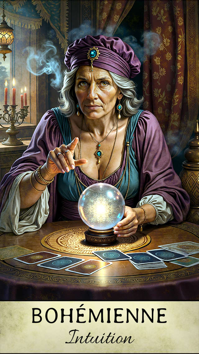 Dans cette vie, vous étiez une bohémienne, itinérante, intuitive et héritière d'un savoir transmis de génération en génération. Vous lisiez les présages dans les cartes, les lignes de la main, ou le marc de café. Mais au-delà de ces outils, c'est votre regard aiguisé, et votre capacité à ressentir au-delà des mots qui guidaient ceux qui venaient vers vous.